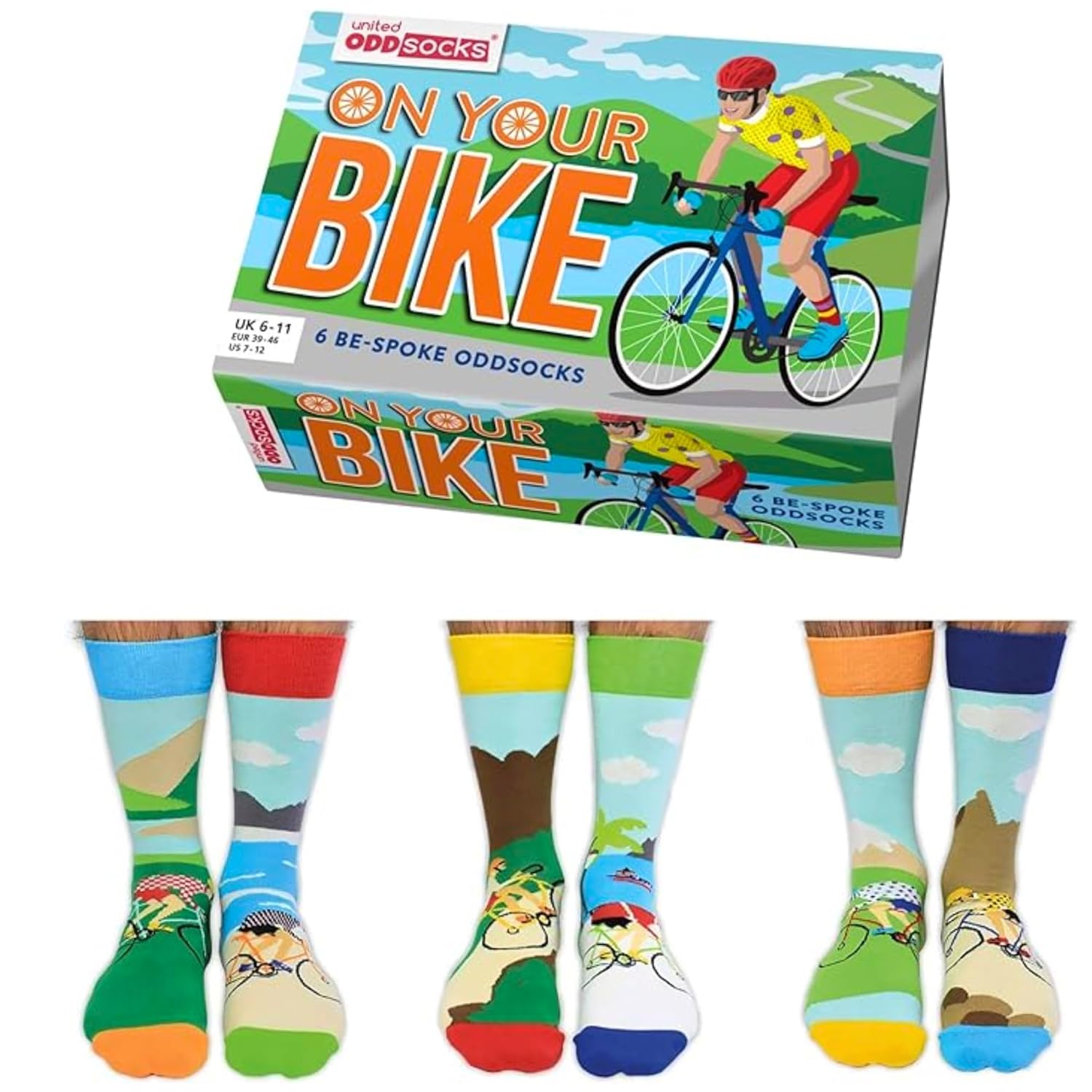 United Oddsocks On Your Bike Box of 6 Odd Socks for Men,UK 6-11 | EUR 39-46 | US 7-12. Fun and Quirky Birthday,Christmas,Father’s Day Gift for Men